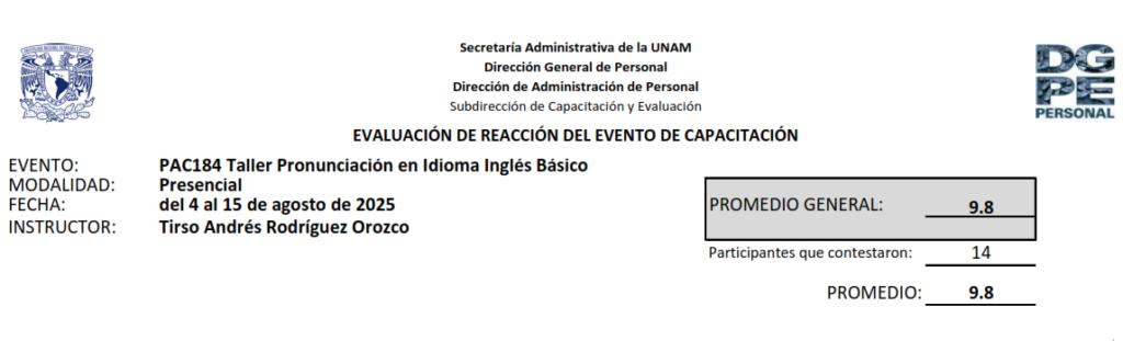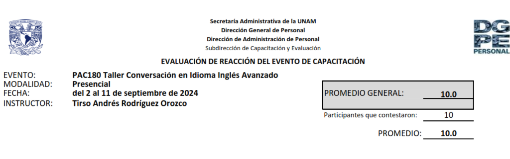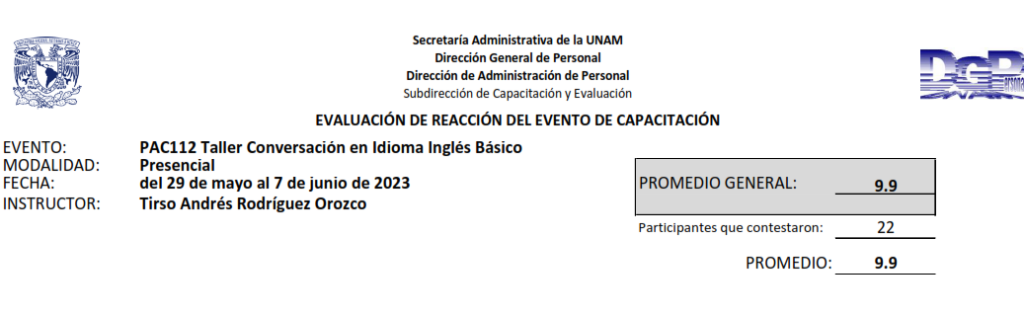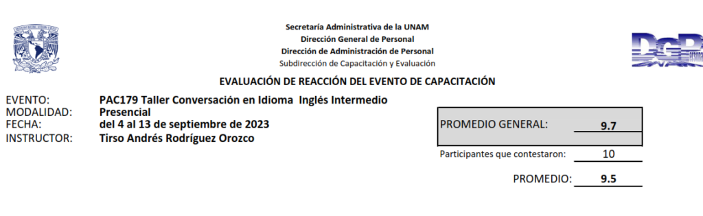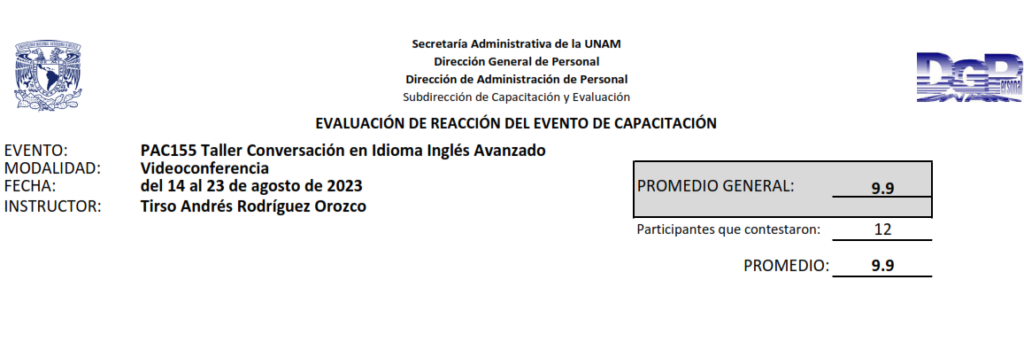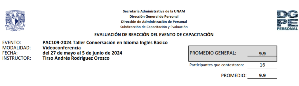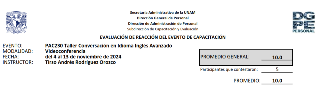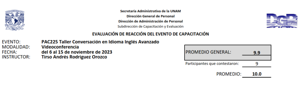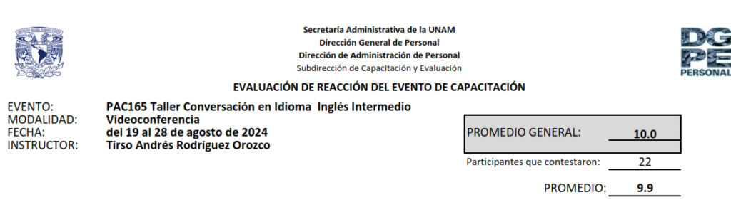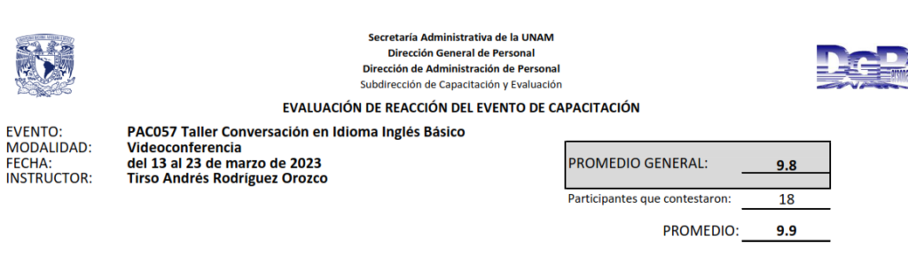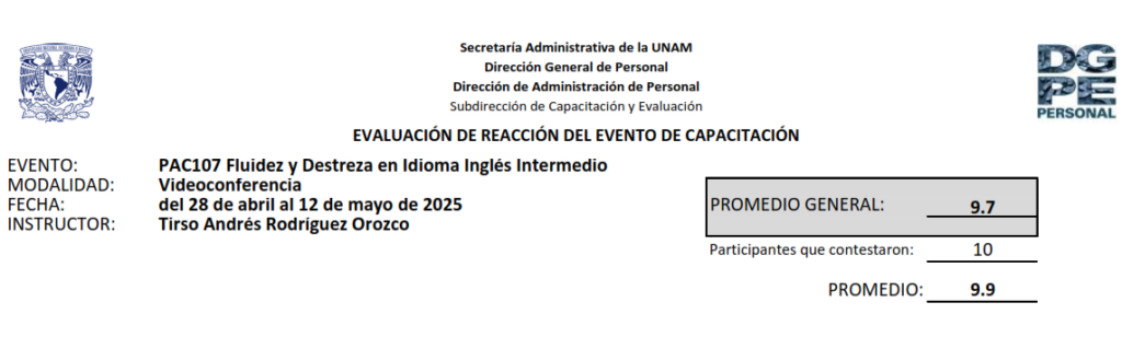 Las evaluaciones de reacción que se comparten, provienen de talleres impartidos en la UNAM (Nov.2022 – Nov.2025), donde participa Tirso Rodríguez como facilitador externo ofreciendo capacitación especializada para personal de confianza y funcionarios. Estos testimonios tienen un valor particular porque forman parte de un proceso formal, estructurado y completamente imparcial, aplicado por una institución reconocida que avala la calidad de su labor docente. El prestigio académico de la UNAM, sumado a la objetividad de sus participantes —quienes no tienen relación previa con él—, ofrece evidencia clara, confiable y profesional sobre la efectividad de sus cursos y su desempeño como facilitador. Además, cuenta con cartas de recomendación de empresas y clientes particulares, las cuales podemos compartir con gusto a solicitud. Por ello, estos testimonios institucionales refuerzan su trayectoria profesional y ofrecen a futuros clientes la confianza de que su trabajo está respaldado por estándares académicos y de calidad plenamente comprobados.